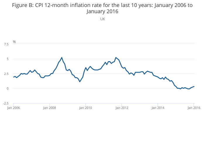 Download this chart Figure B: CPI 12-month inflation rate for the last 10 years: January 2006 to January 2016