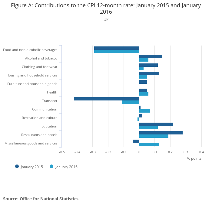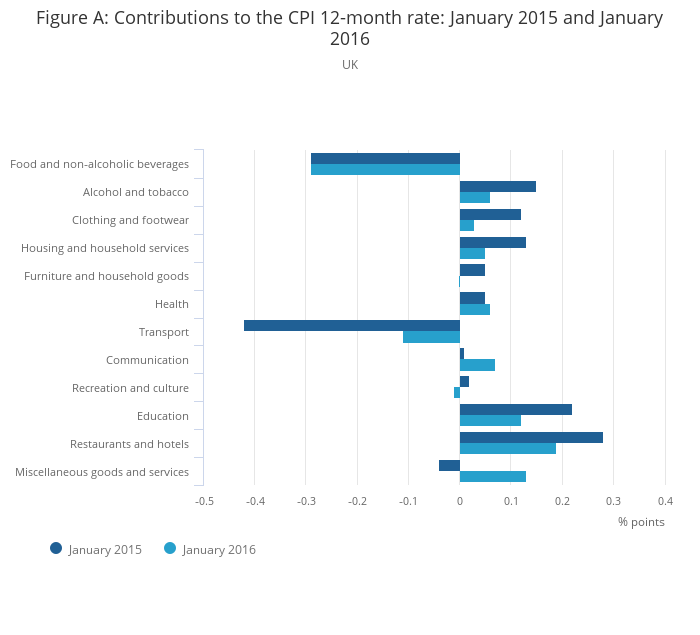 Figure A shows the contributions to the CPI 12-month rate in January 2016 compared with the contributions to the 12-month rate a year earlier. A larger version of the chart can be viewed by clicking on it (HTML version only).
