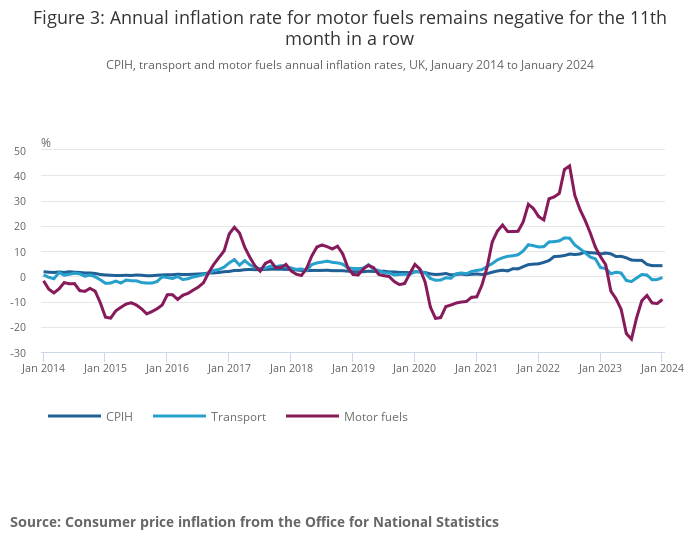 CPIH, transport and motor fuels annual inflation rates, UK, January 2014 to January 2024