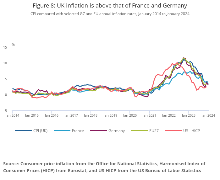 CPI compared with selected G7 and EU annual inflation rates, January 2014 to January 2024