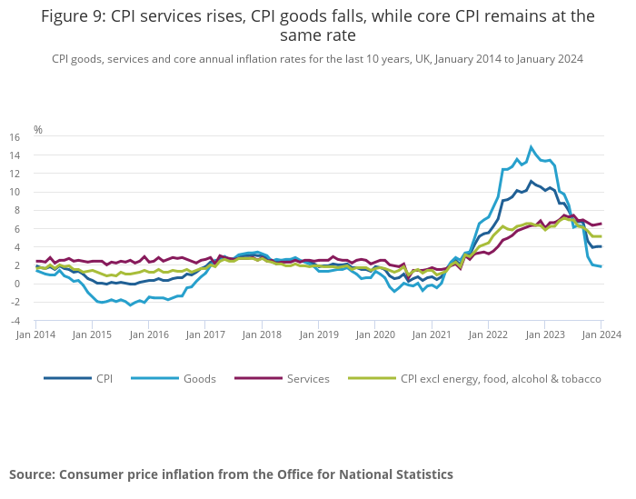 CPI goods, services and core annual inflation rates for the last 10 years, UK, January 2014 to January 2024