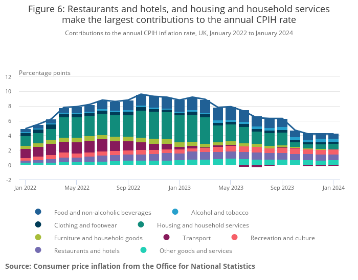 The Consumer Prices Index including owner occupiers' housing costs (CPIH) rose by 4.2% in the 12 months to January 2024, the same rate as in December 2023.