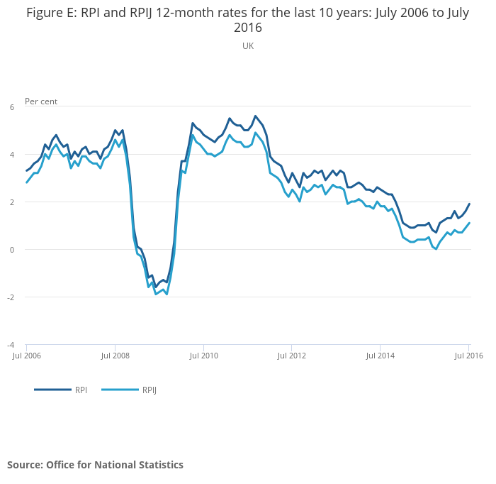 Download this chart Figure E: RPI and RPIJ 12-month rates for the last 10 years: July 2006 to July 2016