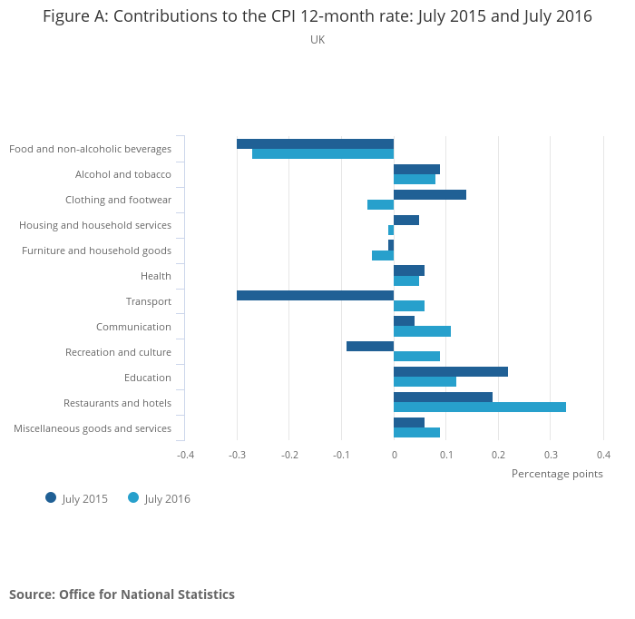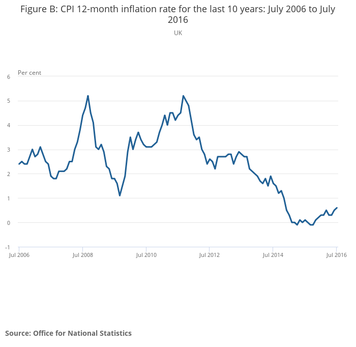 The CPI 12-month rate (the amount prices change over a year) between July 2015 and July 2016 stood at 0.6%. This means that a basket of goods and services that cost £100.00 in July 2015 would have cost £100.60 in July 2016.