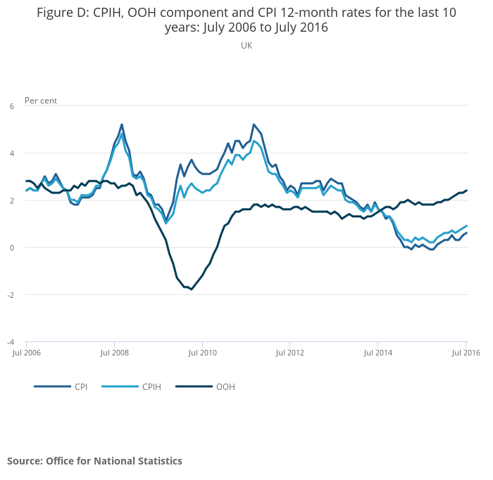 Download this chart Figure D: CPIH, OOH component and CPI 12-month rates for the last 10 years: July 2006 to July 2016