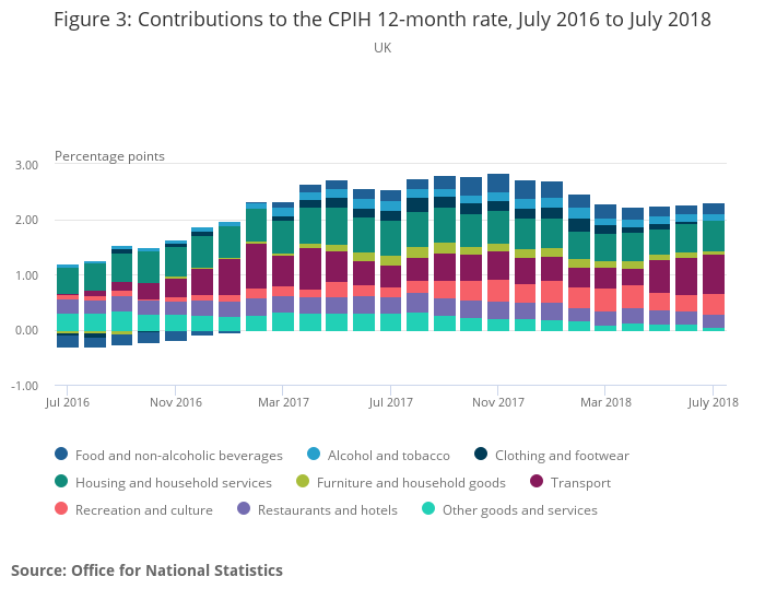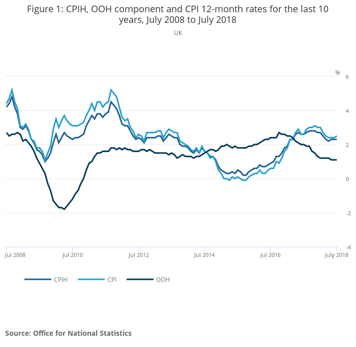 The Consumer Prices Index including owner occupiers’ housing costs (CPIH) 12-month inflation rate was 2.3% in July 2018, unchanged from June 2018.