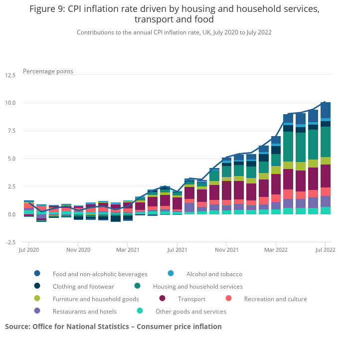 - The largest upward contributions to the annual CPIH inflation rate in July 2022 came from housing and household services (principally from electricity, gas and other fuels, and owner occupiers' housing costs), transport (principally motor fuels), and food and non-alcoholic beverages.