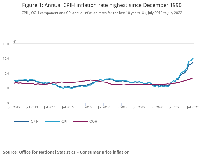 - The Consumer Prices Index including owner occupiers' housing costs (CPIH) rose by 8.8% in the 12 months to July 2022, up from 8.2% in June.