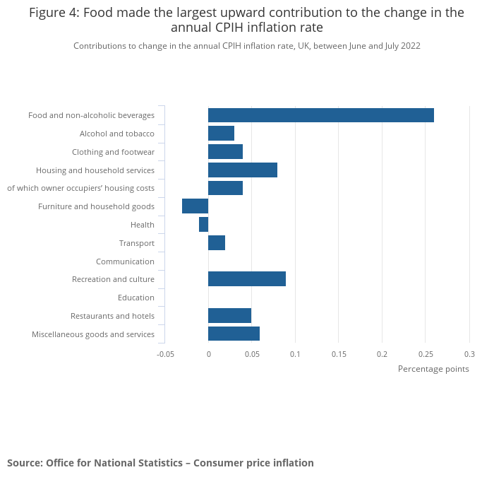 The rise in inflation this month reflected prices rises across many parts of the basket. The largest movement (of 0.26 percentage points) in the annual Consumer Prices Index including owner occupiers' housing costs (CPIH) inflation rate in July 2022 came from food and non-alcoholic beverages. This upward movement was three times the size of the next largest contribution – from recreation and culture (0.09 percentage points).