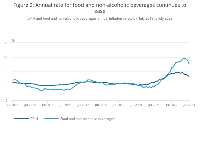 Food and non-alcoholic beverage prices rose by 0.1% between June and July 2023, compared with a rise of 2.3% between the same two months a year ago. This resulted in an easing in the annual rate to 14.9% in July 2023, the slowest annual rate of growth since September 2022. This is down from 17.4% in June 2023 and from a recent high of 19.2% in March 2023, which was the highest annual rate seen for over 45 years.