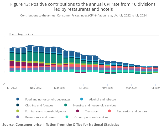 Contributions to the annual Consumer Prices Index (CPI) inflation rate, UK, July 2022 to July 2024