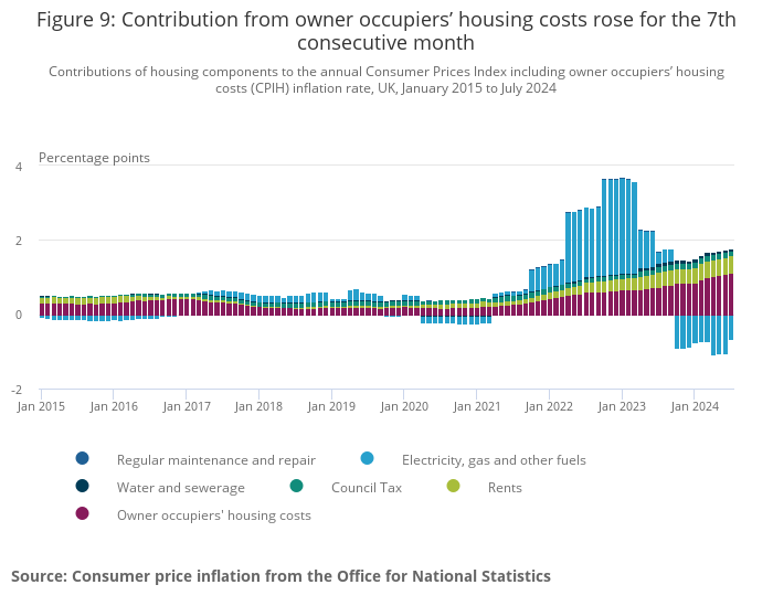 The owner occupiers’ housing costs (OOH) component of CPIH rose by 7.0% in the 12 months to July 2024, up from 6.8% in the 12 months to June. This is the highest annual rate since March 1992 in the constructed historical series. OOH costs rose by 0.6% on the month, compared with a 0.4% increase between June and July 2023.