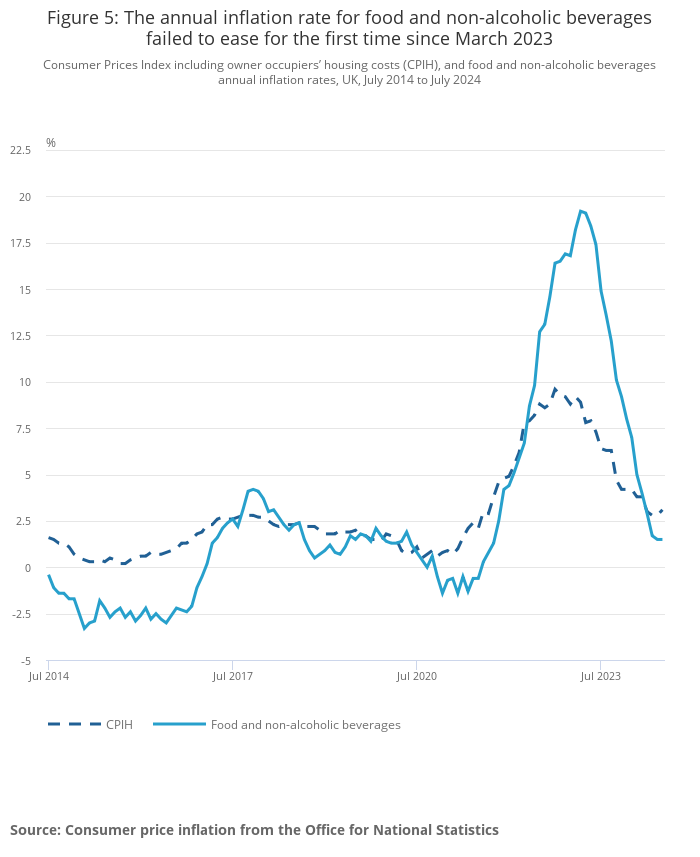 Consumer Prices Index including owner occupiers’ housing costs (CPIH), and food and non-alcoholic beverages annual inflation rates, UK, July 2014 to July 2024