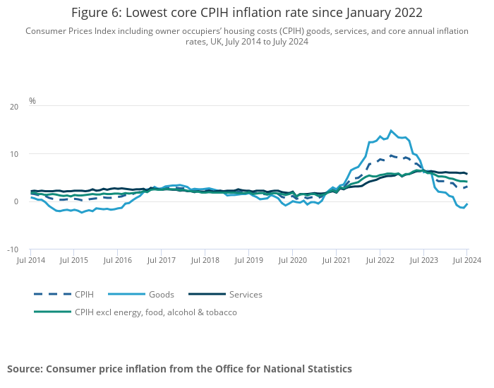 - Core CPIH (excluding energy, food, alcohol, and tobacco) rose by 4.1% in the 12 months to July 2024, down from 4.2% in June; the CPIH goods annual rate rose from negative 1.4% to negative 0.5%, while the CPIH services annual rate fell from 6.0% to 5.7%.