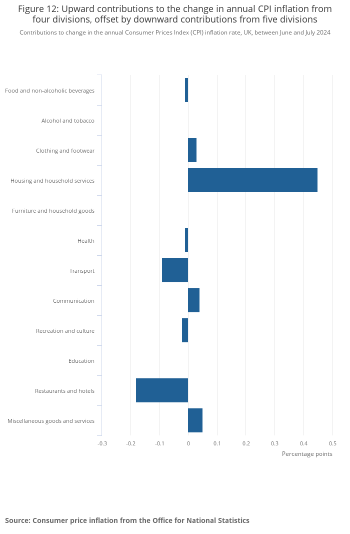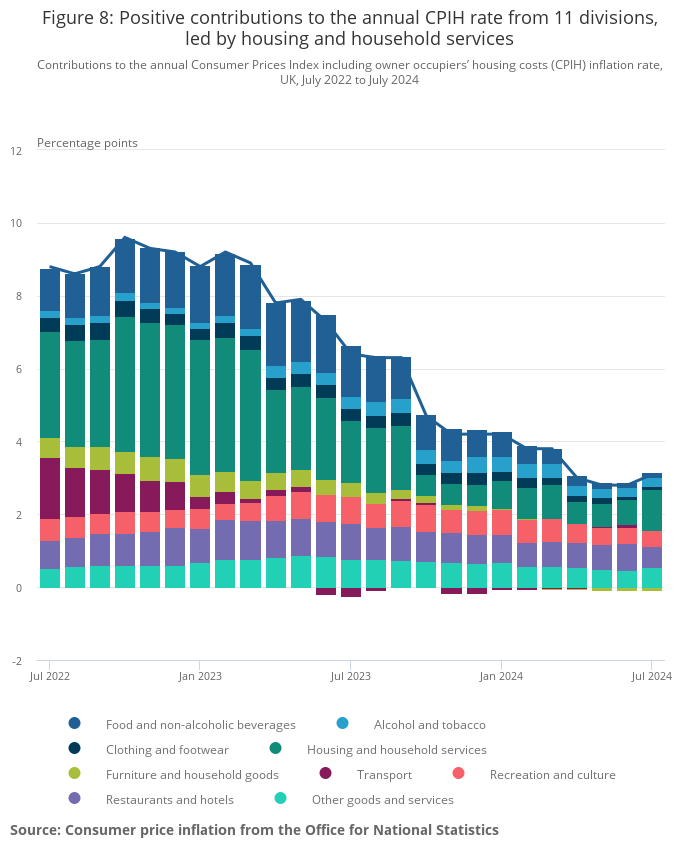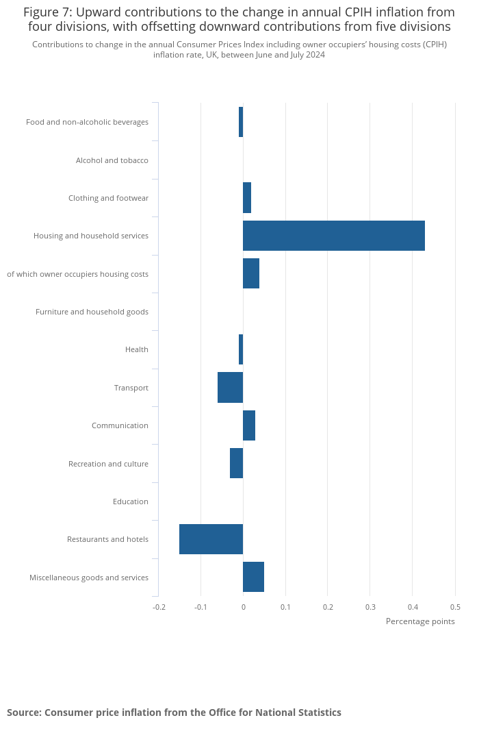 The rise in the annual CPIH inflation rates in July 2024 reflected upward contributions from four divisions, offset by downward contributions from five. The largest upward effect came from housing and household services. The largest downward effects came from restaurants and hotels, and transport.