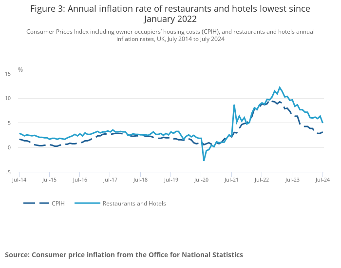 Prices for restaurants and hotels fell by 0.4% between June and July this year, compared with a rise of 0.9% a year ago. The annual rate rose by 4.9% in the year to July 2024, down from 6.3% in the year to June. The slower annual rate was almost entirely because of the price of hotels, which saw a monthly fall of 6.4% compared with a rise of 8.2% a year ago.