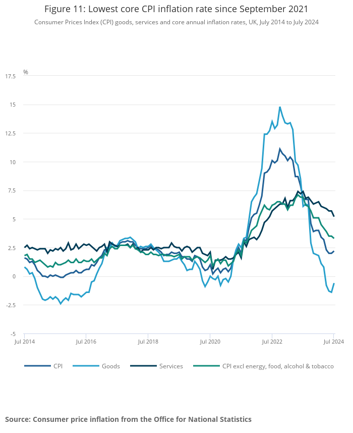 Consumer Prices Index (CPI) goods, services and core annual inflation rates, UK, July 2014 to July 2024