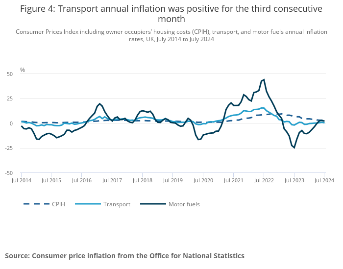 Consumer Prices Index including owner occupiers’ housing costs (CPIH), transport, and motor fuels annual inflation rates, UK, July 2014 to July 2024