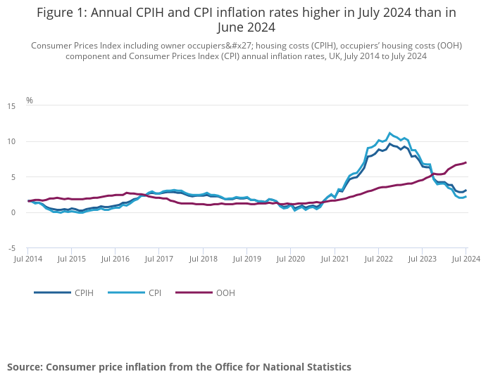 - The Consumer Prices Index including owner occupiers' housing costs (CPIH) rose by 3.1% in the 12 months to July 2024, up from 2.8% in June 2024.