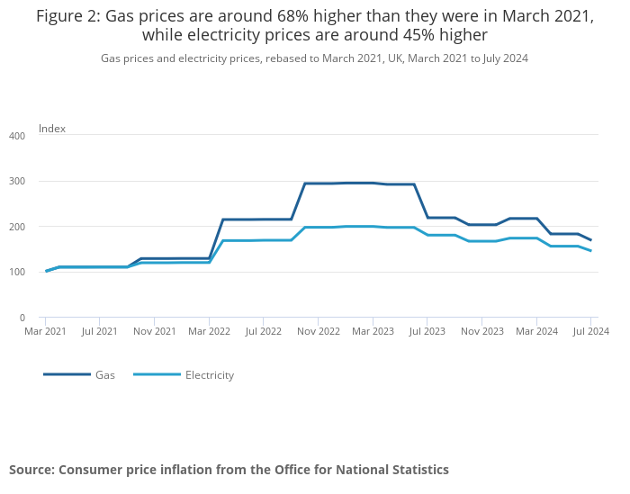 Although energy prices are lower in July 2024 than they were a year ago and are much lower than their peak in the first quarter of 2023, gas and electricity prices in July 2024 are still around 68% and 45% higher, respectively, than in March 2021.