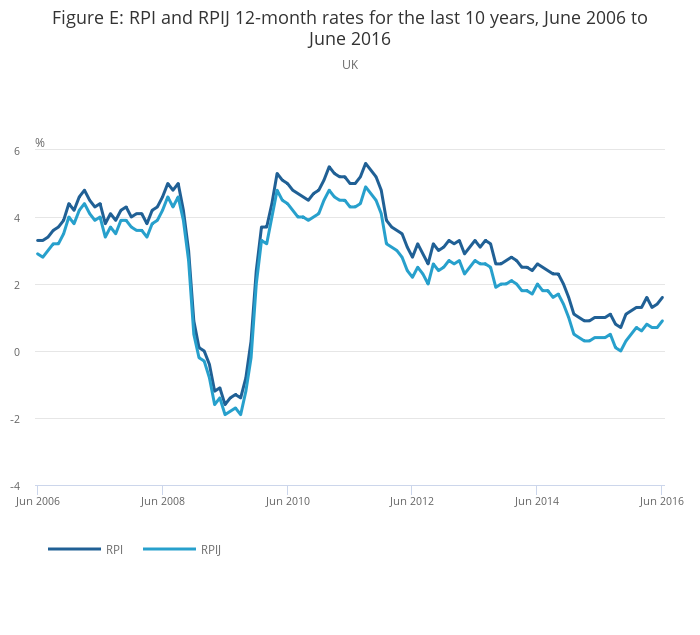 Download this chart Figure E: RPI and RPIJ 12-month rates for the last 10 years, June 2006 to June 2016