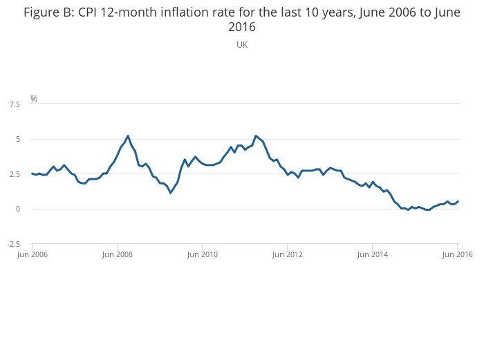 Download this chart Figure B: CPI 12-month inflation rate for the last 10 years, June 2006 to June 2016