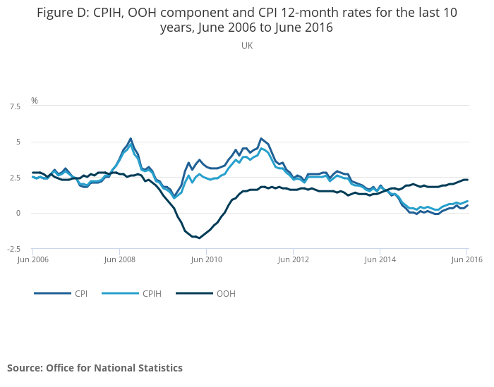 In June 2016, the 12-month rate (the rate at which prices increased between June 2015 and June 2016) for CPIH stood at 0.8%, up from 0.7% in May 2016. The difference between the CPI and CPIH annual rates in June 2016 was 0.3 percentage points, down from 0.4 percentage points in May. This narrowing was principally due to rounding. Owner occupiers’ housing costs increased by 0.1% between May and June 2016, the same as the movement between these months a year earlier. This meant that they had a negligible impact on the change in the CPIH 12-month rate between the 2 months.