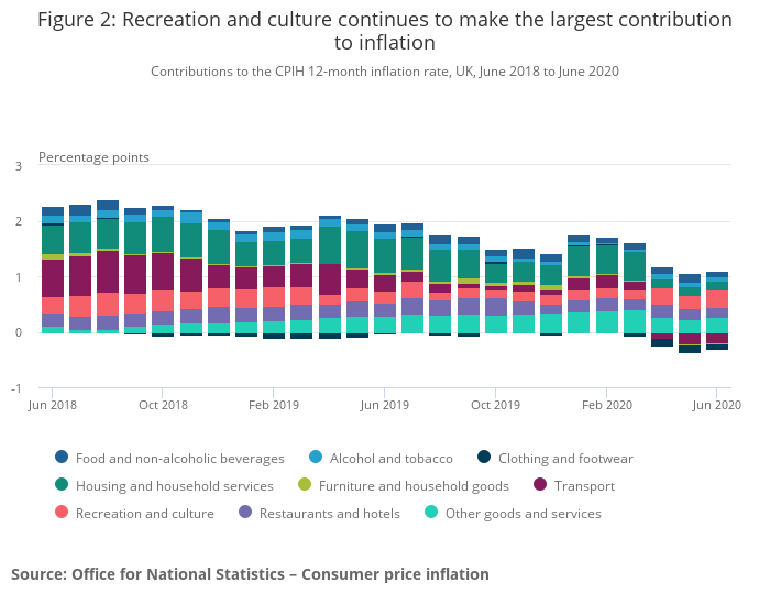 The largest contribution to the CPIH 12-month inflation rate in June 2020 came from recreation and culture (0.32 percentage points).