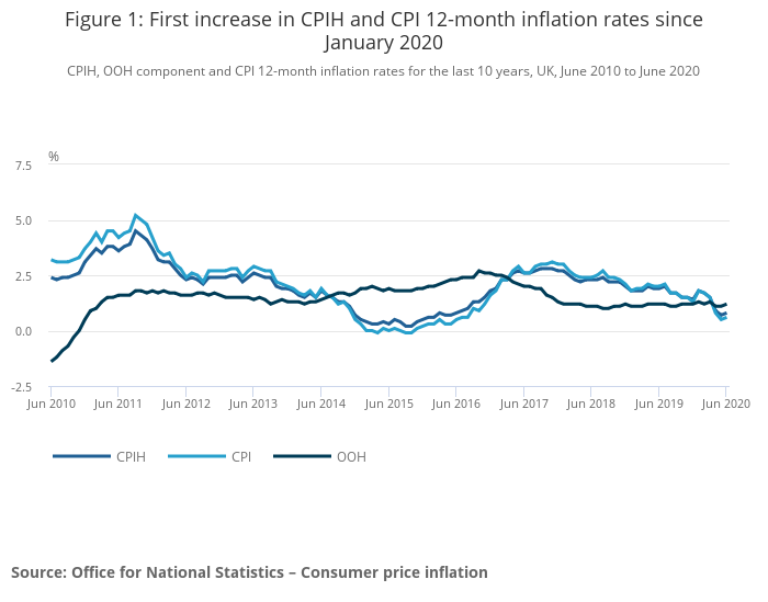 The Consumer Prices Index including owner occupiers' housing costs (CPIH) 12-month inflation rate was 0.8% in June 2020, up from 0.7% in May 2020.