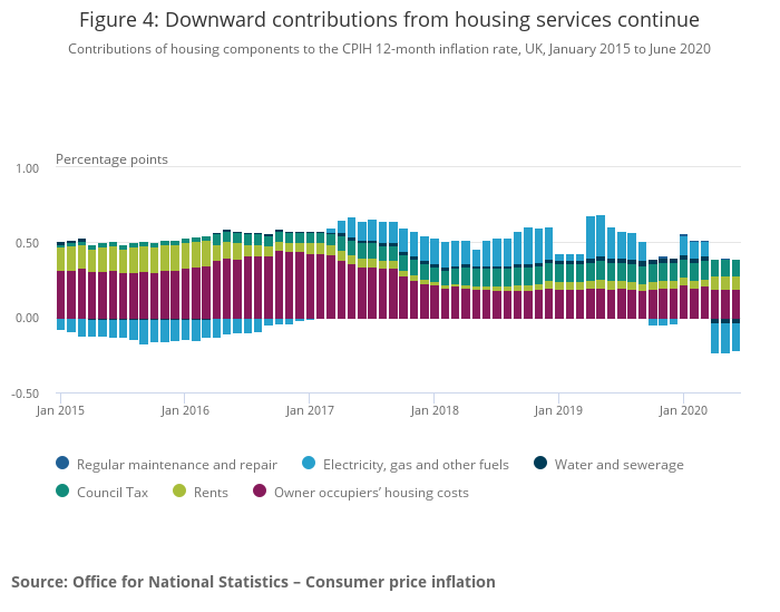 Image .csv .xlsFigure 4 shows the contribution of owner occupiers' housing costs (OOH) and Council Tax to the Consumer Prices Index including owner occupiers' housing costs (CPIH) 12-month inflation rate in the context of wider housing-related costs. In April 2020, the contribution of housing components to the CPIH 12-month inflation rate fell to its lowest level since November 2010 and remained around that same level through to June. The fall since March was caused by reduced contributions from electricity, gas, liquid fuels, water supply and sewerage collection. These five categories had a combined downward contribution to the CPIH 12-month rate of 0.22 percentage points in June.