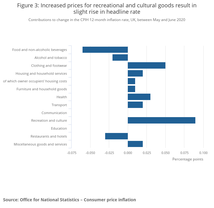 Image .csv .xlsFigure 3 shows how each of the main groups of goods and services contributed to the change in the Consumer Prices Index including owner occupiers' housing costs (CPIH) 12-month inflation rate between May and June 2020. The corresponding figures for the Consumer Prices Index (CPI) can be found in column F of Table 26 in the Consumer price inflation dataset.