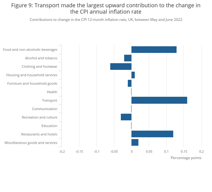 The largest movements in the annual CPI inflation rate in June 2022 came from transport and food.