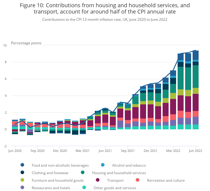 The largest upward contributions to the annual CPIH inflation rate in June 2022 came from housing and household services (principally from electricity, gas and other fuels, and owner occupiers' housing costs) and transport (principally from motor fuels).