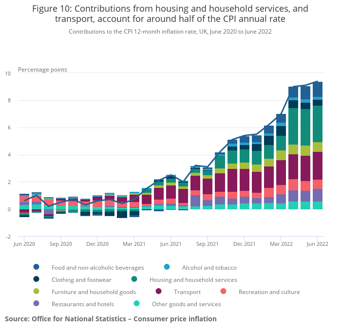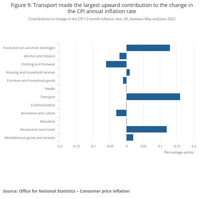 The largest upward contributions to the annual CPIH inflation rate in June 2022 came from housing and household services (2.82 percentage points, principally from electricity, gas and other fuels, and owner occupiers' housing costs) and transport (1.64 percentage points, principally from motor fuels).