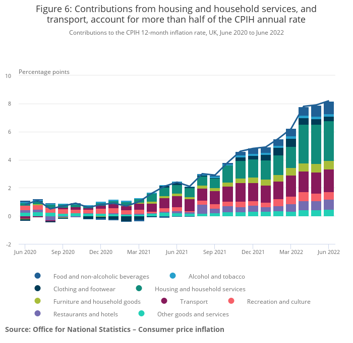 The Consumer Prices Index including owner occupiers' housing costs (CPIH) rose by 8.2% in the 12 months to June 2022, up from 7.9% in May.