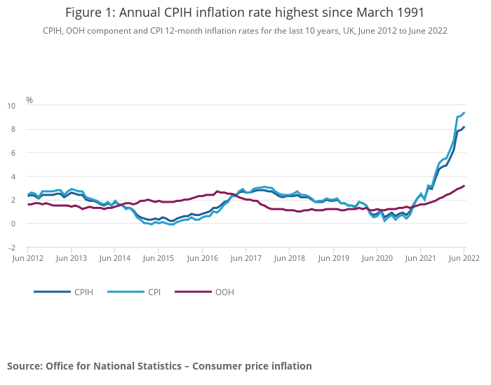 The Consumer Prices Index including owner occupiers' housing costs (CPIH) rose by 8.2% in the 12 months to June 2022, up from 7.9% in May.