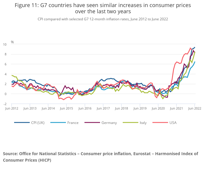 CPI compared with selected G7 12-month inflation rates, June 2012 to June 2022