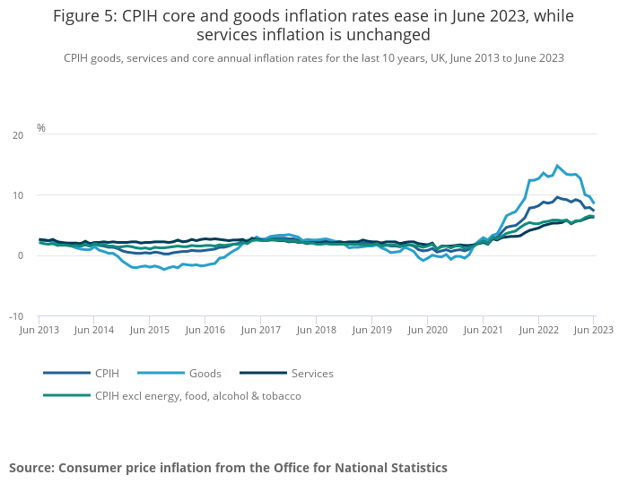 Figure 5: CPIH core and goods inflation rates ease in June 2023, while services inflation is unchanged