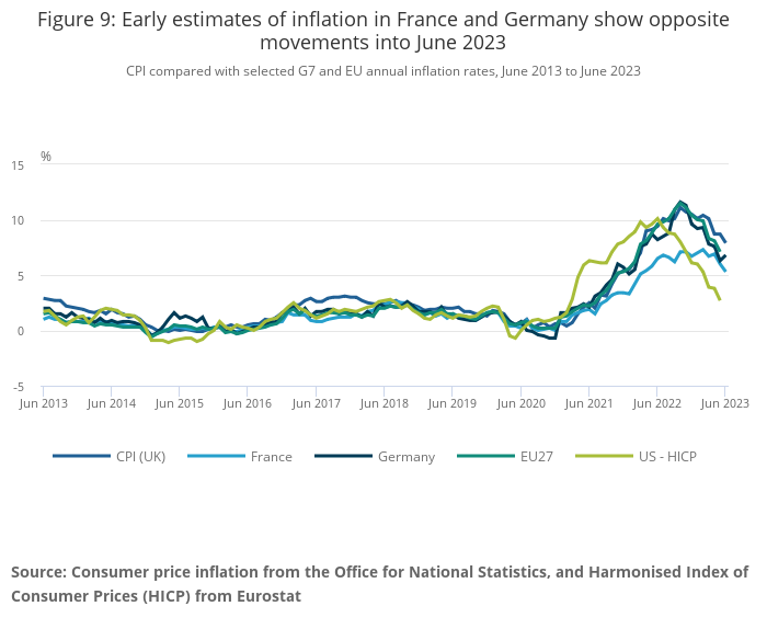 Figure 9 shows CPI inflation against the EU and Group of Seven (G7) countries that produce a comparable measure. Further information on international comparisons can be found in our Food and energy price inflation, UK: 2023 article, released on 23 May 2023.