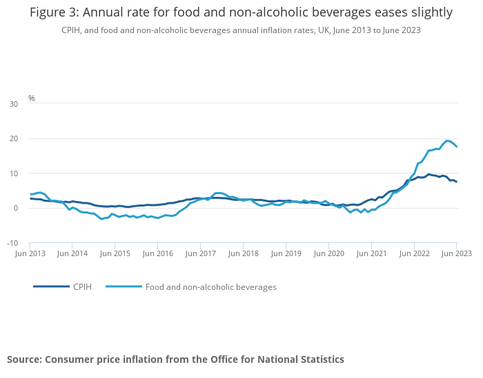 CPIH, and food and non-alcoholic beverages annual inflation rates, UK, June 2013 to June 2023
