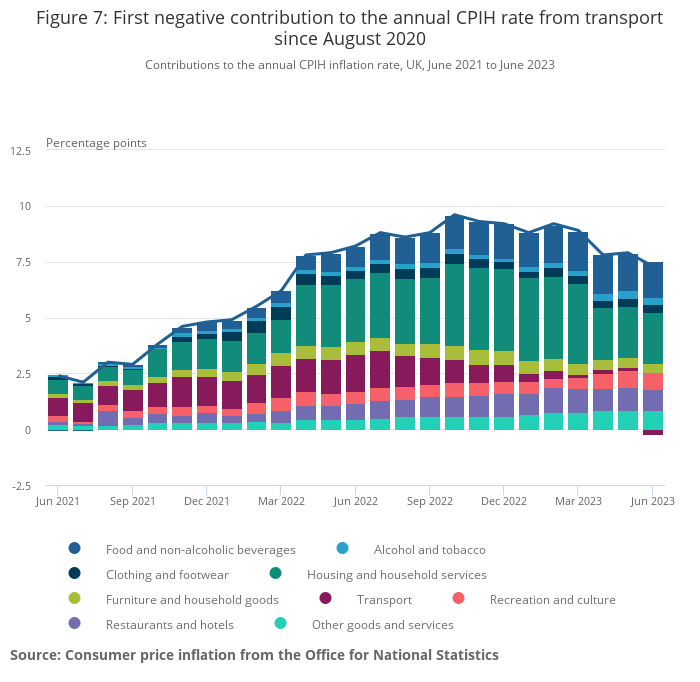 The Consumer Prices Index including owner occupiers' housing costs (CPIH) rose by 7.3% in the 12 months to June 2023, down from 7.9% in May.