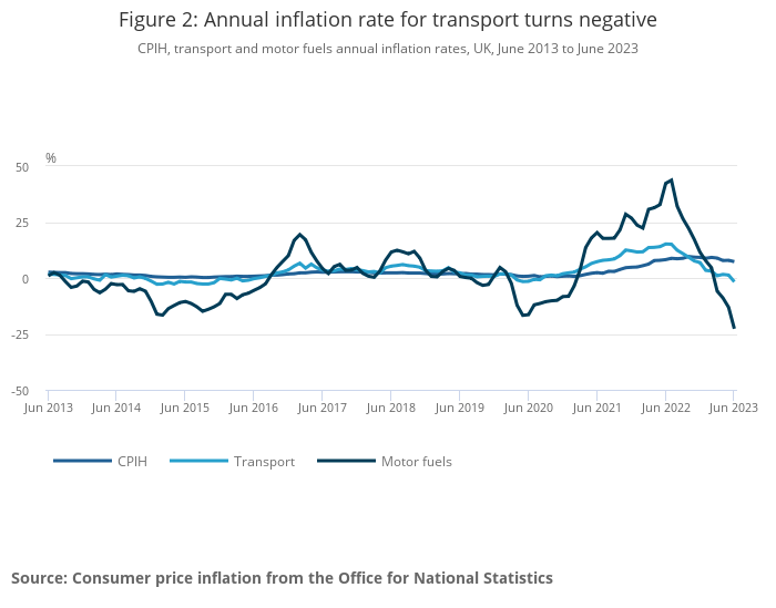 CPIH, transport and motor fuels annual inflation rates, UK, June 2013 to June 2023