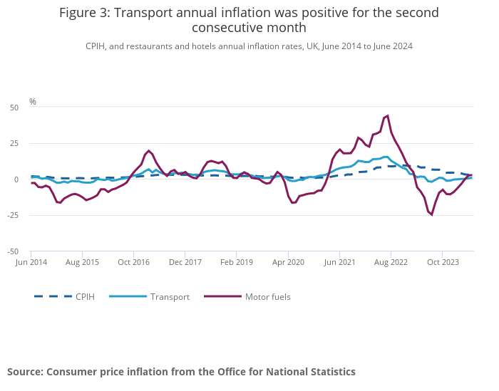 Prices in the transport division rose by 0.7% in the year to June 2024, compared with a rise of 0.3% in the year to May. This is the largest annual price rise since September 2023, where it was also 0.7%. On a monthly basis, prices fell by 0.2% this year, compared with a fall of 0.7% a year ago.