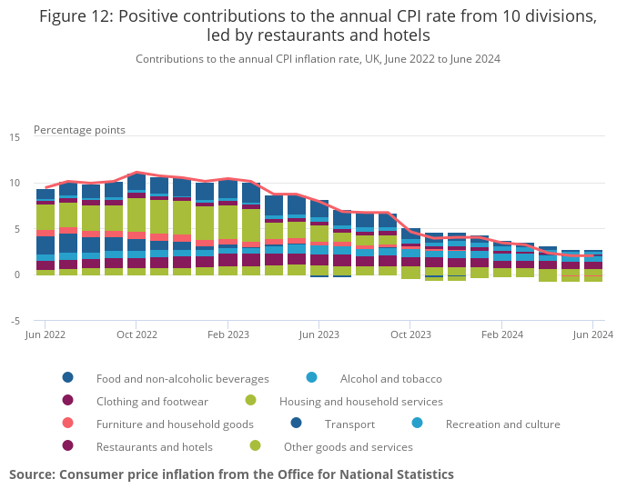 Contributions to the annual CPI inflation rate, UK, June 2022 to June 2024