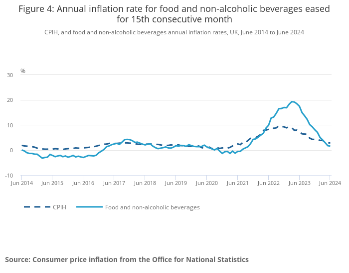 Prices of food and non-alcoholic beverages rose by 1.5% in the year to June 2024, down from 1.7% in the year to May. The June figure is the lowest annual rate since October 2021, when it was 1.3%, and compares with 17.4% a year ago. The annual rate has eased for the 15th consecutive month from a recent high of 19.2% in March 2023, the highest annual rate seen for over 45 years.