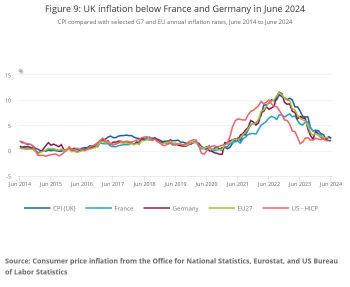 Download this chart Figure 9: UK inflation below France and Germany in June 2024
