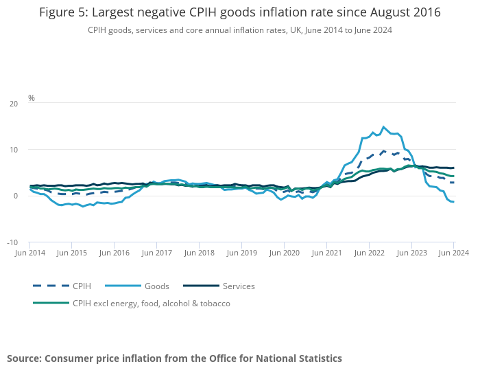 - Core CPIH (excluding energy, food, alcohol and tobacco) rose by 4.2% in the 12 months to June 2024, the same rate as in May; the CPIH goods annual rate fell from negative 1.3% to negative 1.4%, while the CPIH services annual rate rose from 5.9% to 6.0%.