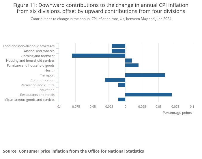 The identical rates in May 2024 and June 2024 reflected downward contributions from six divisions, offset by upward contributions from four divisions. The largest upward effects came from restaurants and hotels, and transport. The largest downward effect came from clothing and footwear.