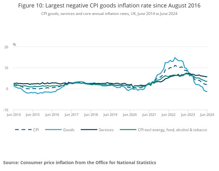 CPI goods, services and core annual inflation rates, UK, June 2014 to June 2024