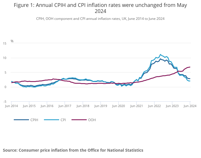 - The Consumer Prices Index including owner occupiers' housing costs (CPIH) rose by 2.8% in the 12 months to June 2024, the same rate as the 12 months to May 2024.